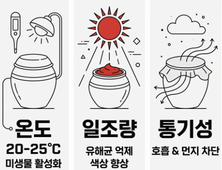 발효가 잘 되기 위해서는 적절한 온도와 습도, 그리고 햇볕이 중요합니다. 너무 춥거나 더운 곳은 피하고, 약 20~25도의 온도를 유지하며 햇볕을 쬐어주는 것이 좋습니다. 햇볕은 고추장의 색을 곱게 하고, 유해균을 억제하며, 발효를 촉진하는 역할을 하거든요. 그래서 전통적으로 고추장을 장독대에 보관했던 것이죠.