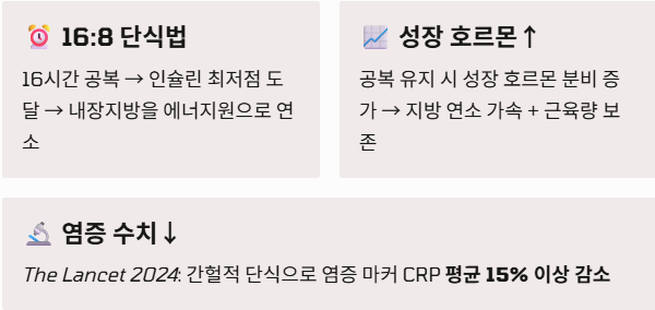 - 성장 호르몬 분비 촉진: 공복 상태가 유지되면 성장 호르몬 분비가 증가하여 지방 연소를 가속화하고 근육량을 보존합니다.