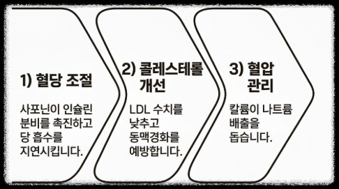 - 콜레스테롤 개선: 혈중 나쁜 콜레스테롤(LDL) 수치를 낮추고 혈관 내 노폐물을 청소하여 동맥경화를 예방합니다.