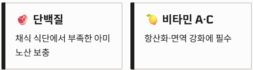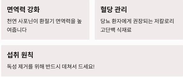 ※ 본 내용은 정보 제공을 목적으로 하며, 의학적 진단이나 의사의 진료를 대신할 수 없습니다. 특정 질환이 있거나 알레르기 체질인 경우 섭취 전 반드시 전문가와 상담하시기 바랍니다.