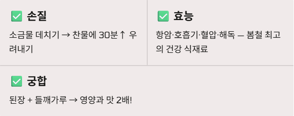 - 들깨가루 활용: 들깨의 고소한 지방 성분은 머위의 쓴맛을 중화시키고 영양 흡수율을 높여줍니다.