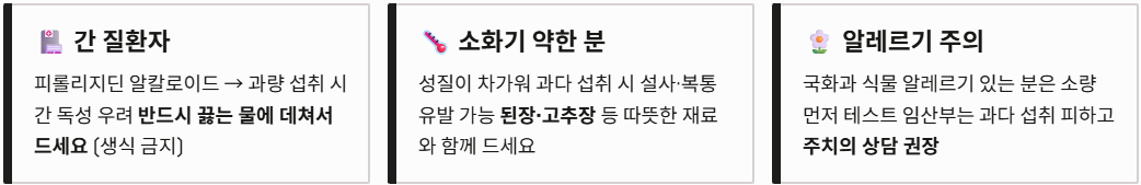 - 알레르기 체크: 국화과 식물에 알레르기가 있는 분들은 섭취 전 소량을 먼저 테스트해보는 것이 안전합니다.