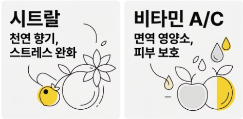 | 시트랄 (Citral) | 천연 향기 성분 | 스트레스 완화 및 진정 |