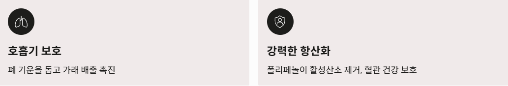 | 시네올 (Cineole) | 거담 및 항균 정유 성분 | 가래 배출 및 호흡기 정화 |