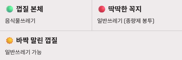 - 수분 함량에 따른 변화: 음식물쓰레기의 핵심 요건 중 하나는 '수분'입니다. 껍질을 바짝 말려 수분이 완전히 제거되고 나무껍질처럼 딱딱해졌다면, 이는 가축의 사료로 부적합해져 '일반쓰레기'로 분류될 수 있습니다.