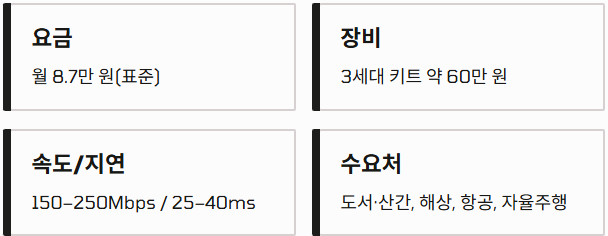 - 통신 속도: 다운로드 속도 150~250Mbps, 지연 시간(Latency) 25~40ms 수준을 유지하며 국내 도서 산간 지역 및 해상 통신 수요를 빠르게 흡수하고 있습니다.