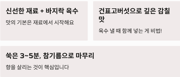 - ✅ 저만의 감칠맛 비법: 멸치 다시마 육수에 건표고버섯과 바지락을 함께 활용하고, 참기름으로 마무리하세요.
