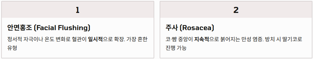 | 구분 | 안면홍조 | 주사 (Rosacea) | 지루성 피부염 |