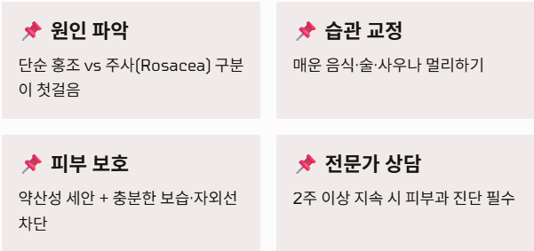 - 과도한 세안과 스크럽: 피부 장벽(Skin Barrier)을 손상시켜 외부 자극에 혈관이 더 민감하게 반응하게 만듭니다.