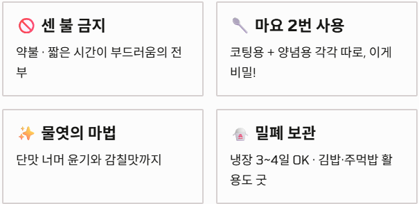 | 핵심 비법 | 마요네즈 코팅, 약불 조리, 양념 후열에 버무리기 |