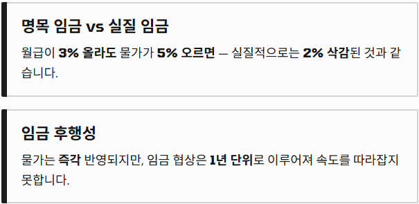 - 임금 후행성: 물가는 즉각적으로 반영되지만, 임금 협상은 보통 1년 단위로 이루어지기에 물가 상승 속도를 따라잡지 못합니다.