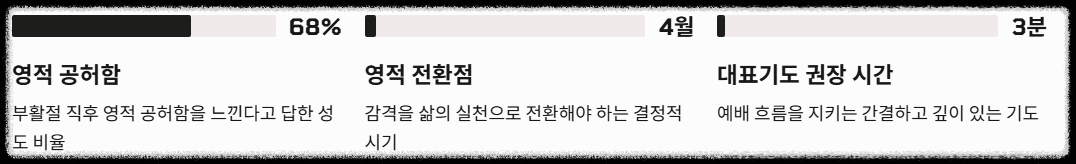 - 최신 통계 기반의 필요성: 2026년 목회데이터연구소 조사에 따르면 성도들의 68%가 "부활절 직후 영적 공허함을 느낀다"고 답했습니다. 4월 둘째 주일 기도는 이 공허함을 채우는 위로의 메시지가 되어야 합니다.