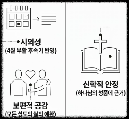 - 보편적 공감: 특정인만 아는 내용이 아닌, 모든 성도가 겪는 삶의 애환을 녹여냅니다.