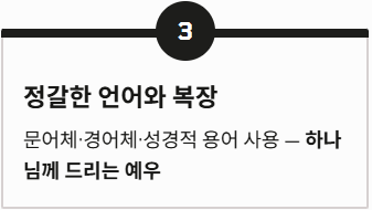 - 정갈한 언어와 복장: 하나님 앞에 드리는 예우인 동시에 회중에게 신뢰감을 주는 요소입니다. 문어체와 경어체를 사용하고, 성경적인 용어를 활용하는 것이 좋습니다.