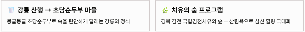 - 강릉 경포 주변 → 순두부 마을: 강릉 산행 후에는 몽글몽글한 초당순두부로 속을 편안하게 달래는 것이 정석입니다.